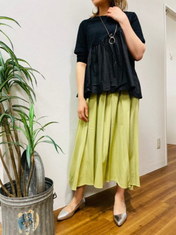 シンプルなロングシャツも良いけれど、総柄シャツを羽織ればいつもと違う雰囲気に。