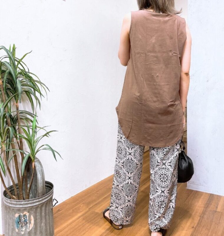 アラベスク柄の個性を生かしてトップスはシンプルに。