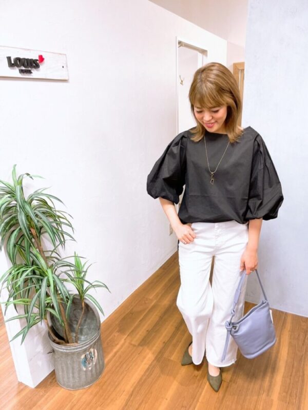 ボリューム袖が可愛いトップスと合わせたモノトーンコーデ。