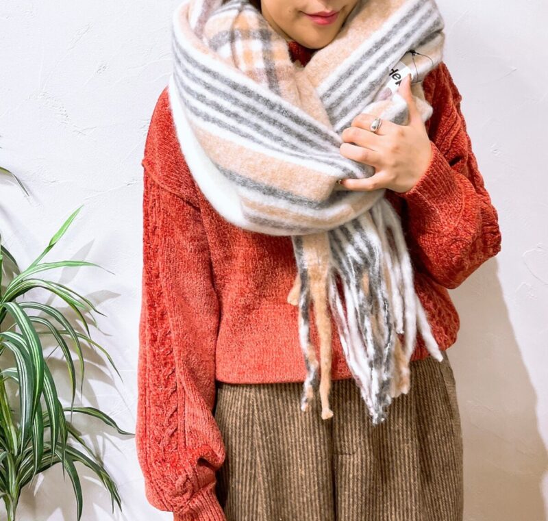 暖かみのあるカラーを取り入れたニットコーデ。